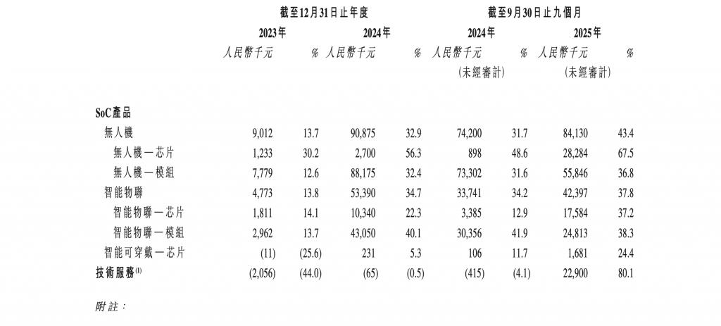 招股书显示,2023-2024 年及 2025 年前三季度(下称:报告期),酷芯微 SoC 产品中无人机与智能物联部分是其收入大头。其中,来自无人机部分的收入分别约 901.2 万、9087.5 万、8413.0 万元,占比分别为 13.7%、32.9%、43.4%;来自智能物联的收入分别约 477.3 万、5339.0 万、4239.7 万元,占比分别为 13.8%、34.7%、37.8%。